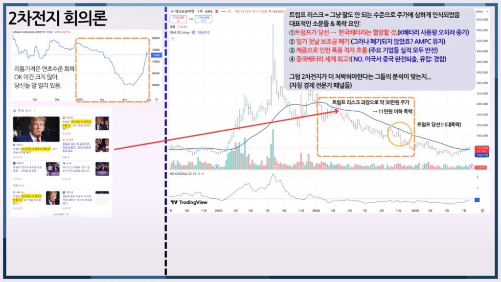 나아가 제가 4일전 올린 영상에서도 에코프로비엠의 차트를 기반으로 상세하게 설명드렸지만 이렇게 상황이 좋아지고 있는 기업의 주가가 계속 처박혀있어야만 한다는 식의 주장은 설득력이 떨어집니다.