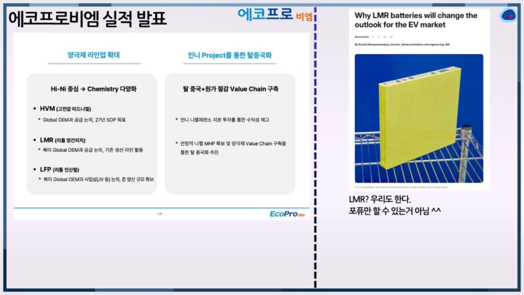또한 최근 GM밸류체인에 있어 퓨처엠이 언급되며 주목받았던 LMR에 대해서도 에코프로비엠이 북미 글로벌 OEM사와 공급을 논의중이라고 밝혔습니다.