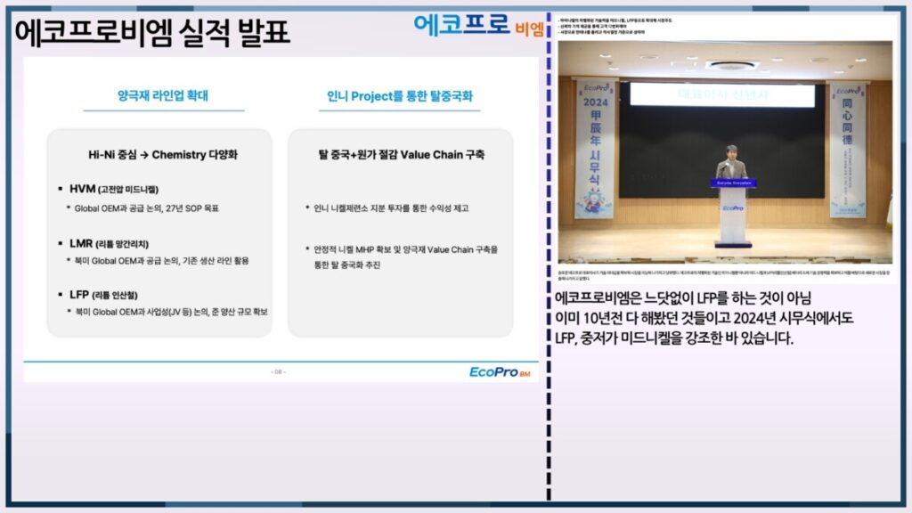 에코프로비엠은 소위말하는 케즘이 시작되던 무렵인 2024년 신년사에서까지 LFP와 미드니켈을 통한 시장 니즈 변화에 선제적으로 대응하겠다고 밝힌 바 있습니다.