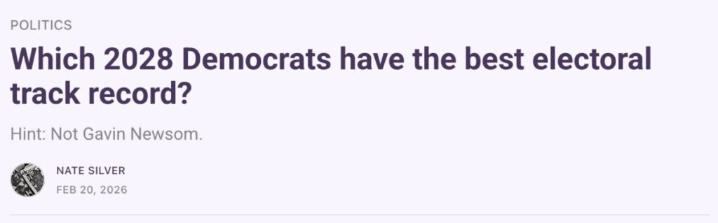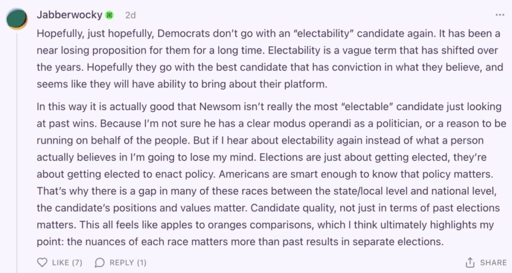 이런 관점에서 보면, 과거의 승리 기록만 봤을 때 뉴섬이 소위 말하는 가장 ‘당선 가능성 높은’ 후보가 아니라는 점은 오히려 다행스러운 일입니다. 저는 그가 정치인으로서 명확한 활동 방식(modus operandi)을 가졌는지, 혹은 국민을 대신해 출마할 명분이 있는지 확신할 수 없기 때문입니다. 하지만 만약 그 사람이 실제로 무엇을 믿는지가 아니라 ‘당선 가능성’이라는 말을 또 듣게 된다면 전 정말 미쳐버릴 것 같습니다.