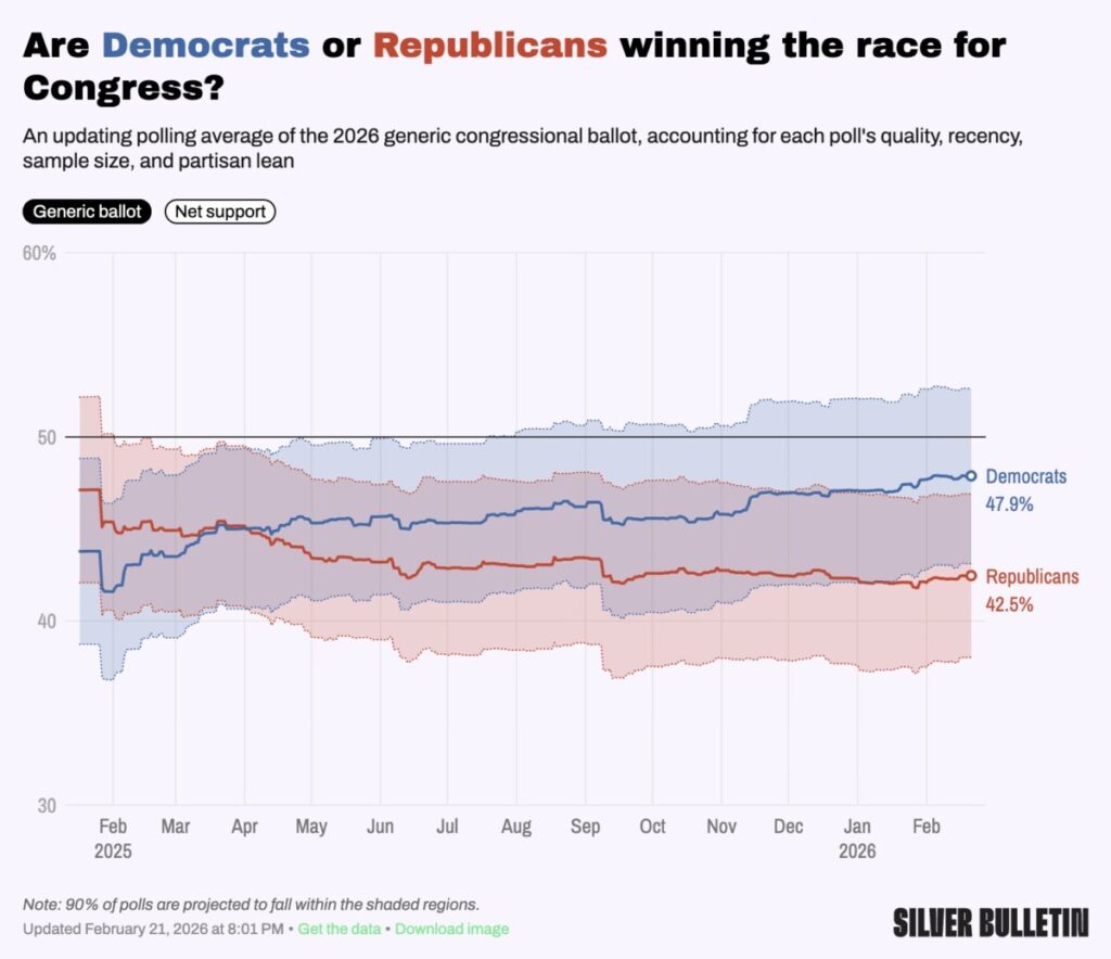 2026년 2월 21일 어제 업데이트에 따르면 2월 한 달 동안 개별 여론조사에서는 공화당 2% 우세부터 시작하여 민주당 8% 우세까지 다양한 결과가 나왔으나 평균적으로 양당 모두 지지율이 느리지만 꾸준히 상승하고 있습니다.