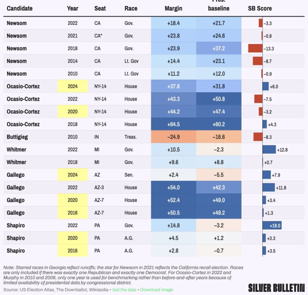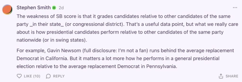 예를 들어, 게빈 뉴섬(솔직히 고백하자면 저는 그의 팬이 아닙니다)은 캘리포니아 내의 평균적인 민주당 후보들보다 뒤처지는 성적을 냅니다. 하지만 더 중요한 점은 실제 대통령 본선에서 그가 펜실베니아의 평균적인 민주당 후보와 비교했을 때 어떤 성과를 보여주느냐 하는 것입니다.