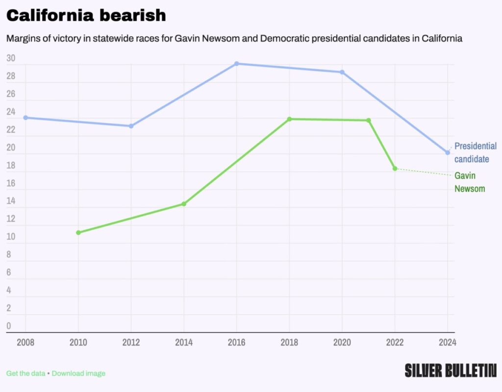 뉴섬은 캘리포니아에서 패배할 위험은 없었으나 대선 기준에는 지속적으로 저조한 득표율을 기록해오고 있다고 지적합니다.