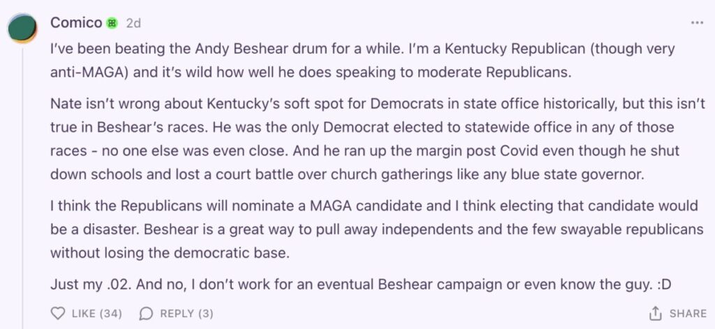 저는 한동안 앤디 버시아를 강력히 지지해 왔습니다. 저는 켄터키주 공화당원이지만(매우 반-MAGA 성향이긴 합니다), 그가 온건파 공화당원들에게 얼마나 설득력 있게 다가가는지 보면 정말 놀라울 정도입니다.